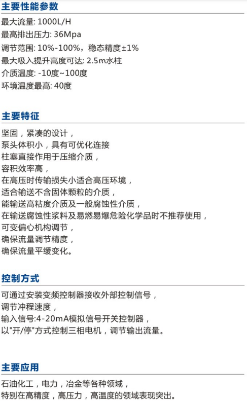 主要性能参数最/大流量: 1000L/H最/高排出压力: 36Mpa调节范围:10%-99.99%, 稳态精度±1%最/大吸入提升高度可达:2.5m水柱介质温度:-10度~100度环境温度最/高:40度主要特征坚固,紧凑的设计,泵头体积小,具有可优化连接柱塞直接作用于压缩介质,容积效率高,在高压时传输损失小适合高压环境,适合输送不含固体颗粒的介